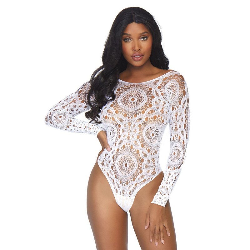 Crochet lace long sleeved snap crotch thong back teddy with a low back.