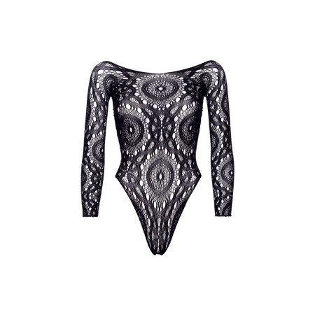 Crochet lace long sleeved snap crotch thong back teddy with a low back.